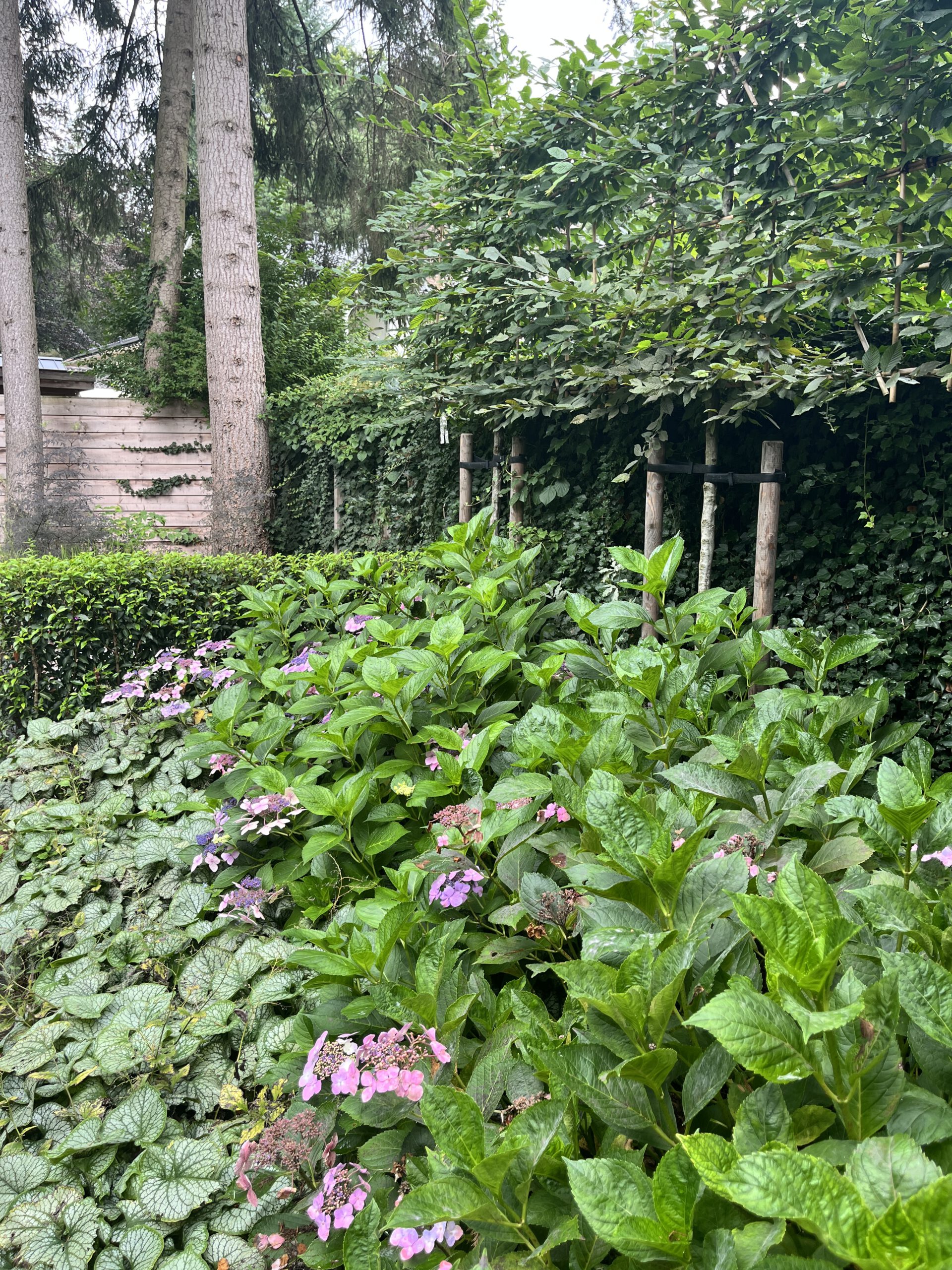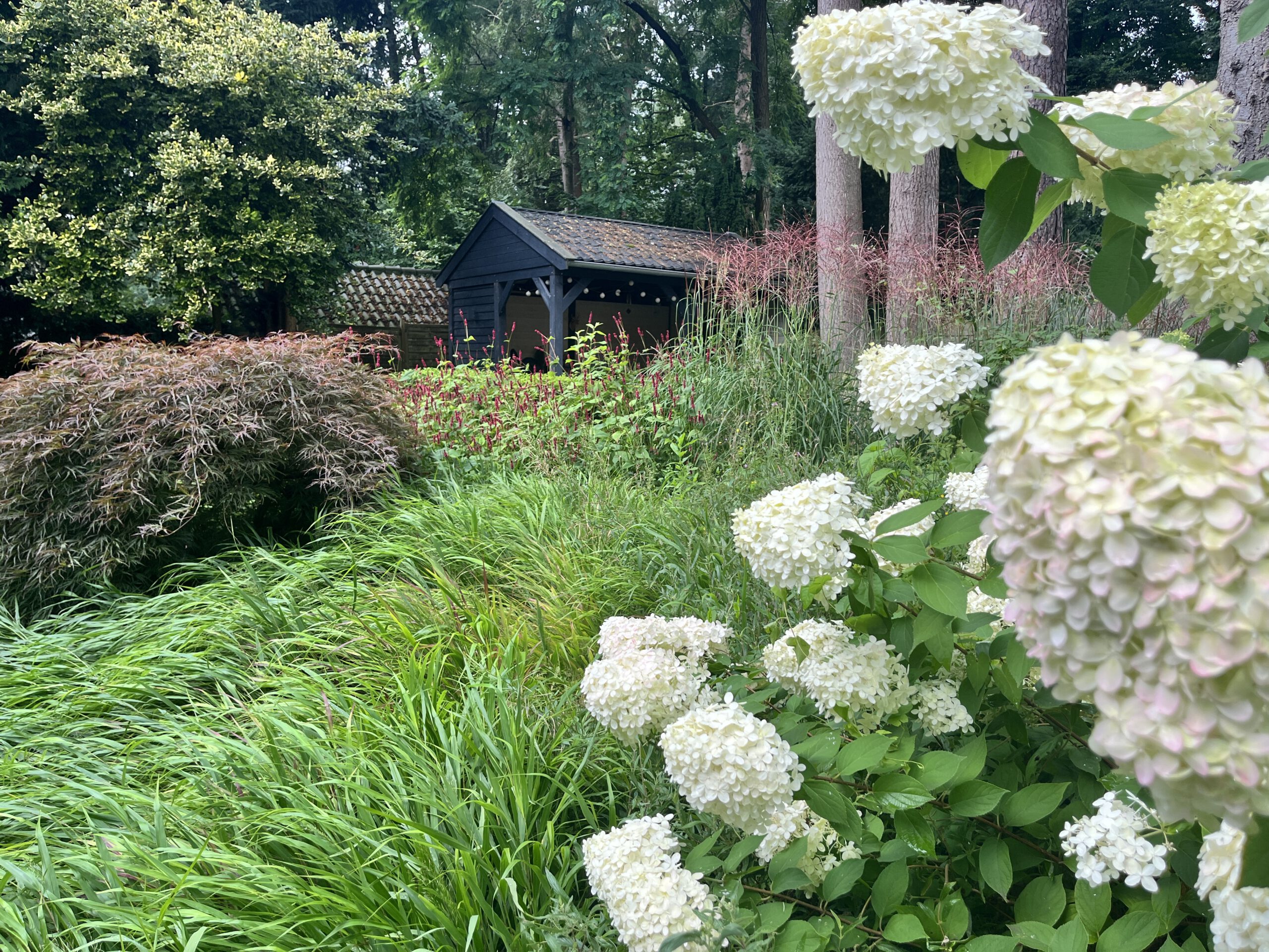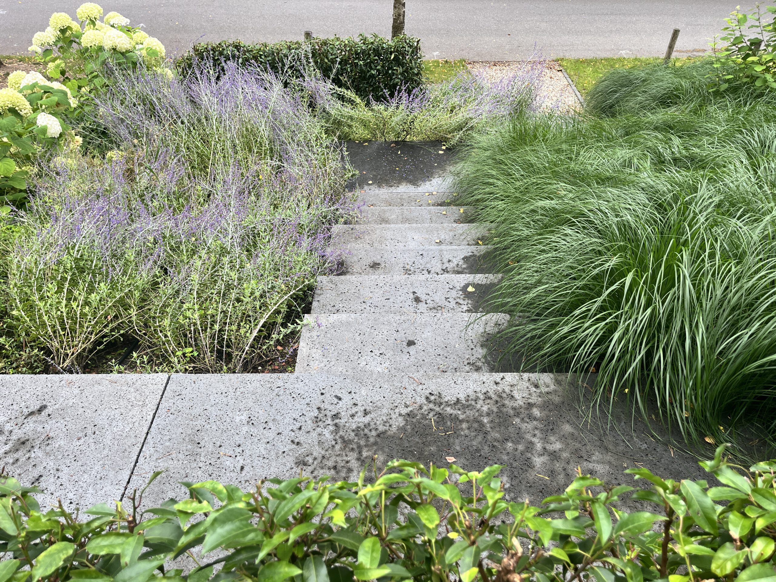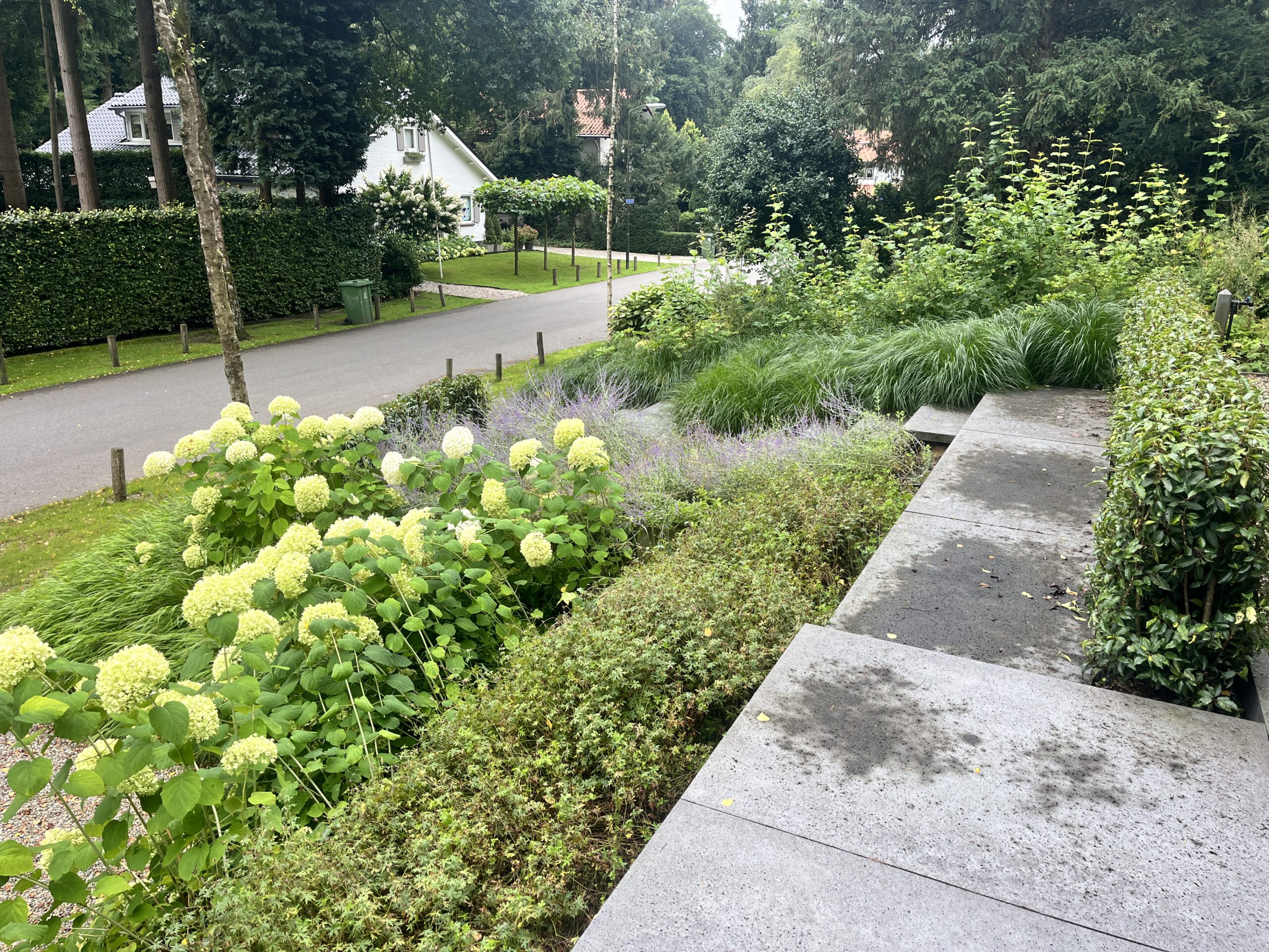 Rondom de woning is een divers sortiment aan beplanting opgenomen wat past bij de woning en omgeving. De hagen van Portugese Laurier zorgen voor de wintergroene structuren, verder zijn de aanwezige grote bomen ingepast in het beplantingsplan. De verschillende groepen met heesters, siergrassen en vaste planten zorgen jaarrond voor veel kleur en afwisseling in de tuin.