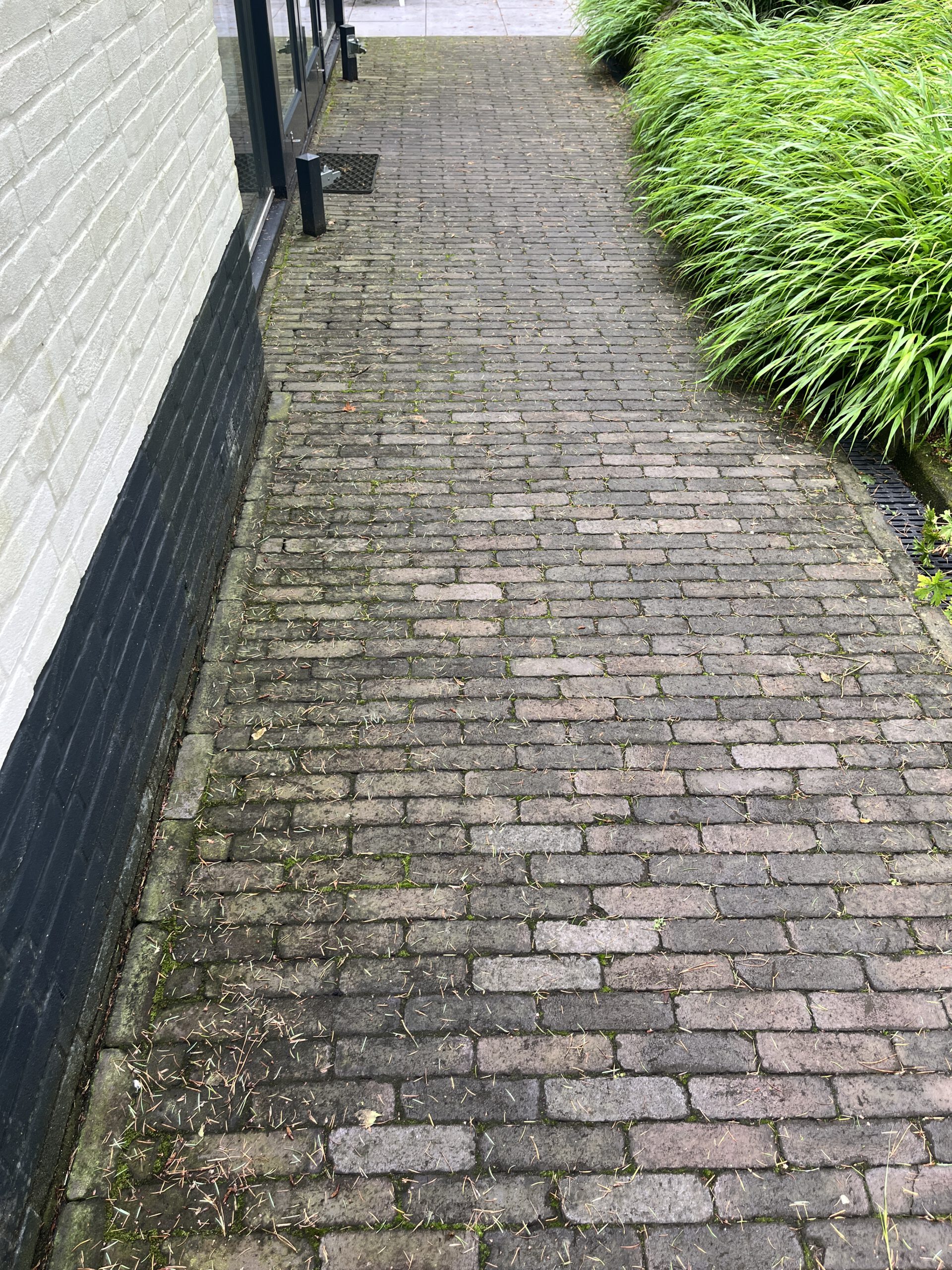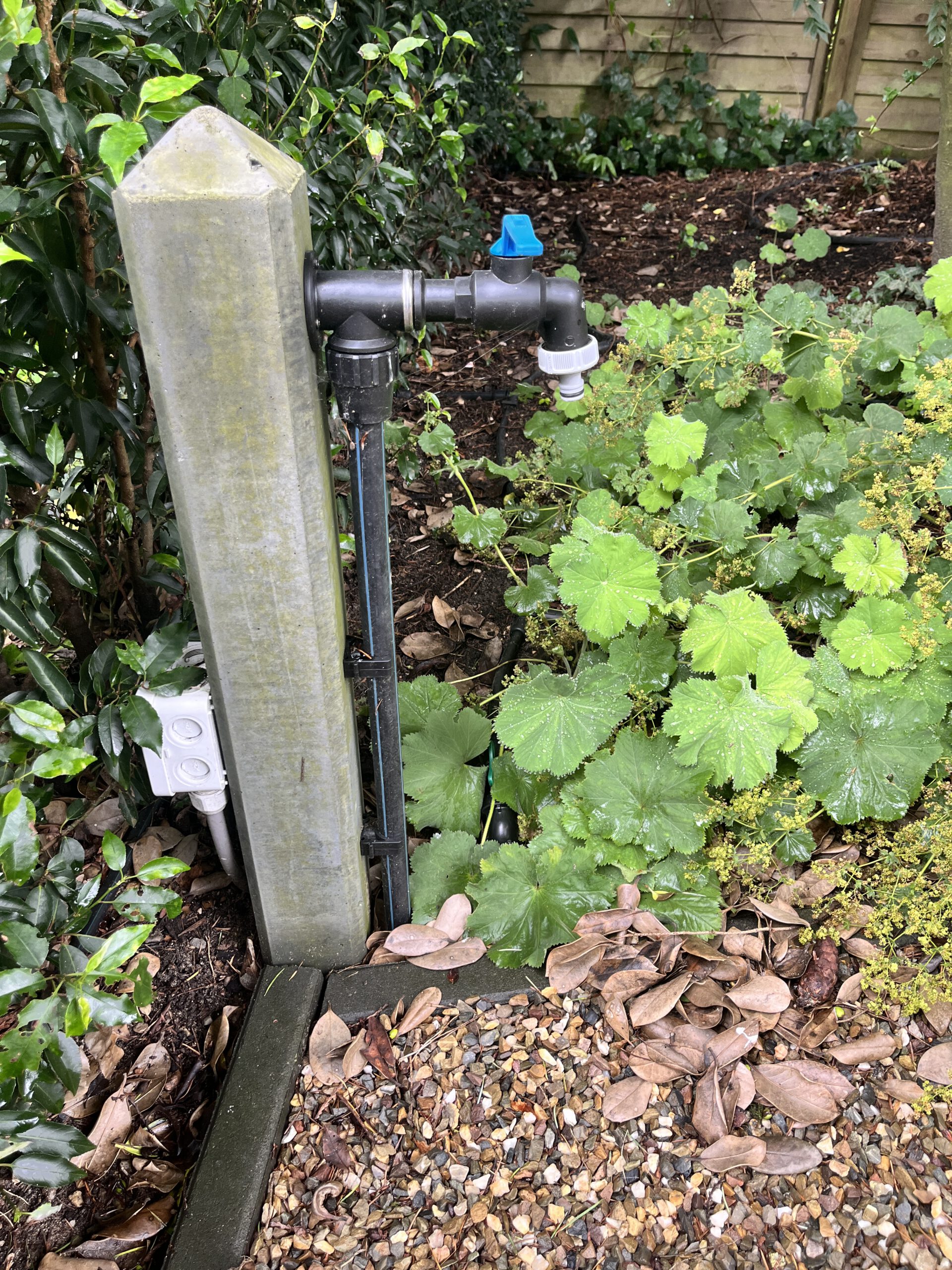 De woning was rondom voor een groot deel al voorzien van paden van gebakken klinkers en een terras van keramische tegels. Er is nog een extra terrasje gemaakt met de Schellevis tegels. Ook is de tuin voorzien van enkele dubbelstaafmat hekwerkpanelen en looppoorten waarmee de tuin ook goed af te sluiten is voor de hond. De complete beregeningsinstallatie met een op afstand bedienbare computer van Hunter zorgt via druppelslangen voor voldoende water bij alle planten, ook zijn enkele tapkranen geplaatst.
