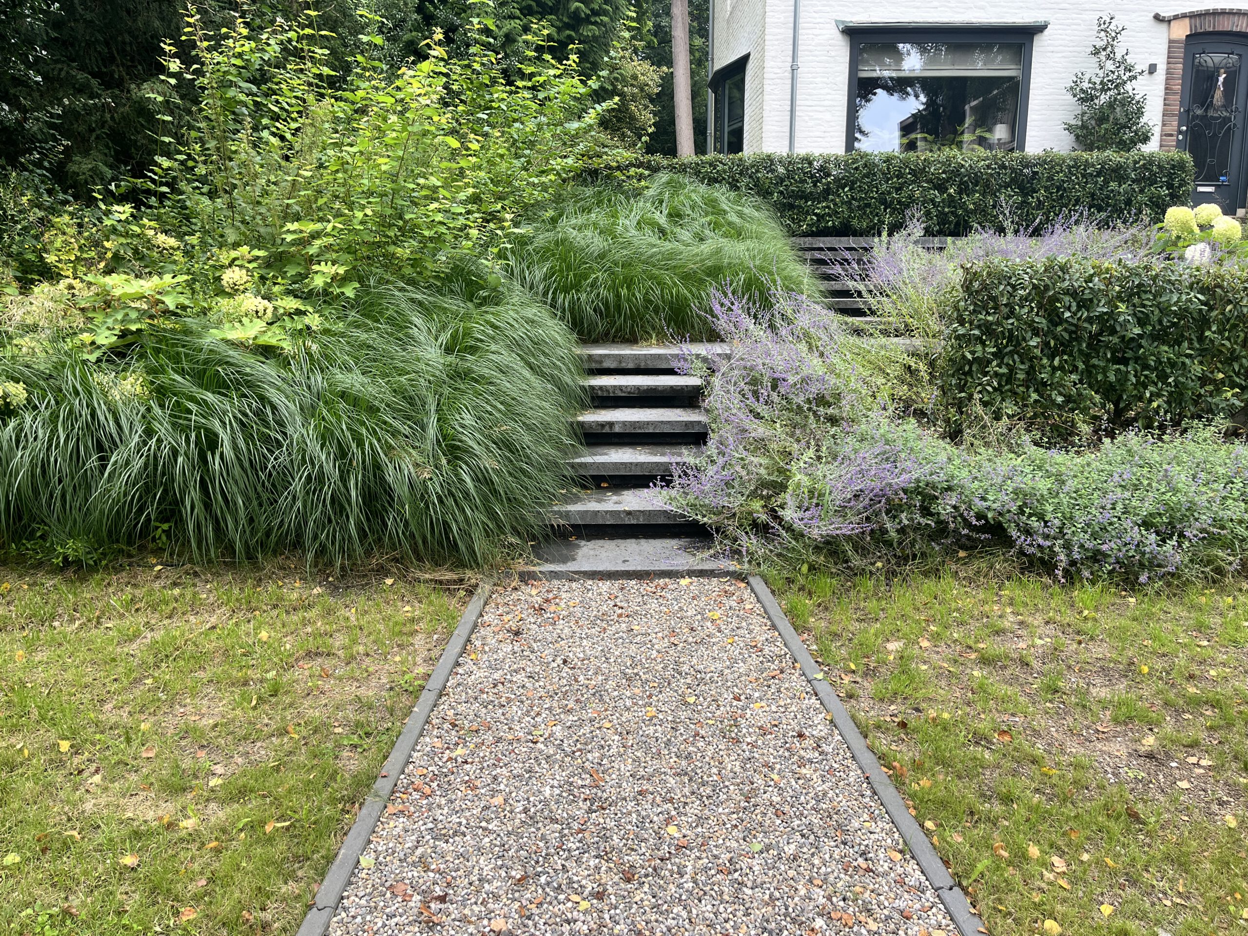 In de bosrijke wijk Berg en Bos in Apeldoorn hebben we een een ontwerp gemaakt voor de tuin bij deze vrijstaande woning. Een uitdaging bij dit ontwerp waren de enorme hoogteverschillen aan de voorkant van deze villa. Het hoogteverschil tussen de weg en de voordeur is namelijk meer dan twee meter! Het ontwerp en beplantingsplan is ook door de hoveniers van Stip Hoveniers gerealiseerd.