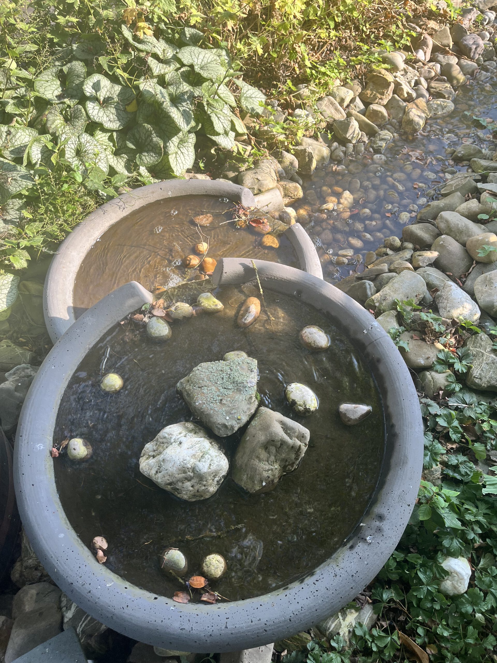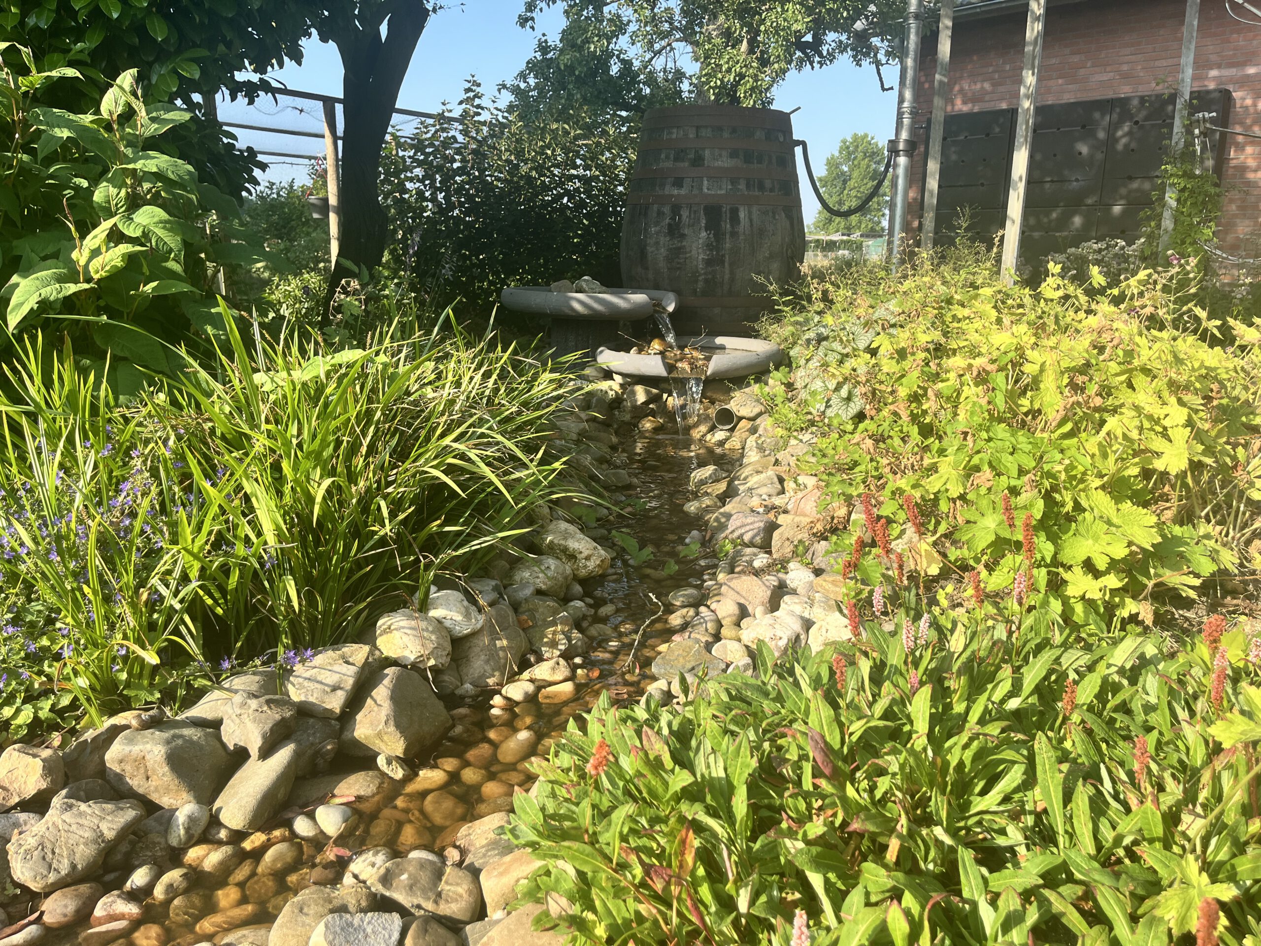 In de voortuin heeft water verder een centrale rol gekregen door de grote vijver die is gerealiseerd. De vijver is voorzien van een bijpassende beekloop die gecombineerd is met twee waterschalen van Creastone. Ook de overstorten van de dakgoten komen via de beekloop uit op deze vijver. Verder is de pomp voor de beekloop voorzien van een extra tappunt om de fruitstruiken van water te kunnen voorzien, de vijver wordt als extra voorraad gebruikt in droge tijden. Rondom de beekloop is verder een divers sortiment aan planten aangebracht.