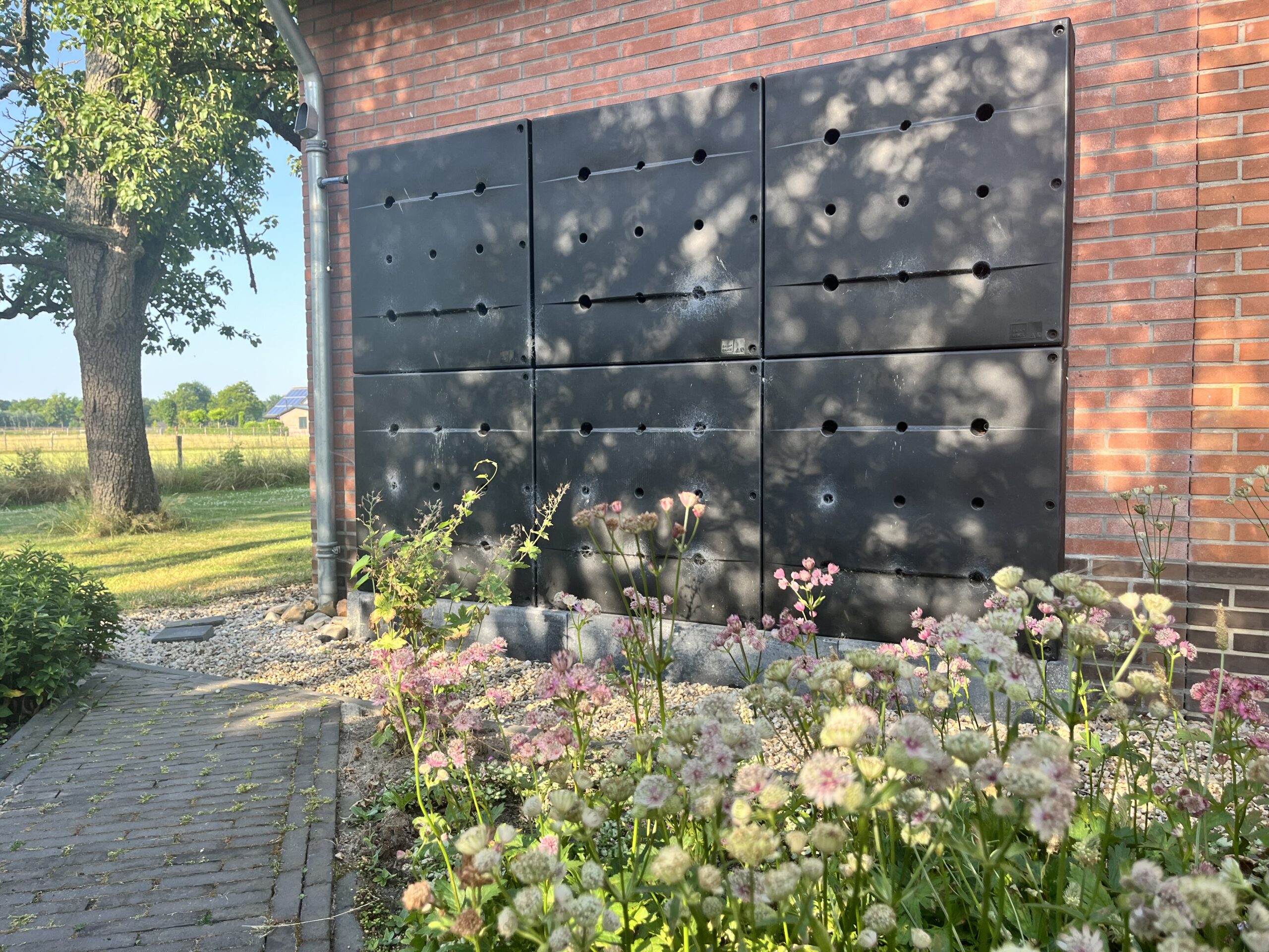 De voortuin is als eerste onderdeel gerenoveerd. Een belangrijk uitgangspunt hierbij was de opslag van het regenwater wat werd aangevoerd vanaf het dak van de woning inclusief de bijbehorende pergola. Naast twee grote portvaten van 500 liter is ook een opslag van zes Rainblocks tegen de gevel aangebracht. Met dit water kan de siertuin in droge tijden van extra water worden voorzien, vooral het aanwezige fruit maakt hier dankbaar gebruik van.