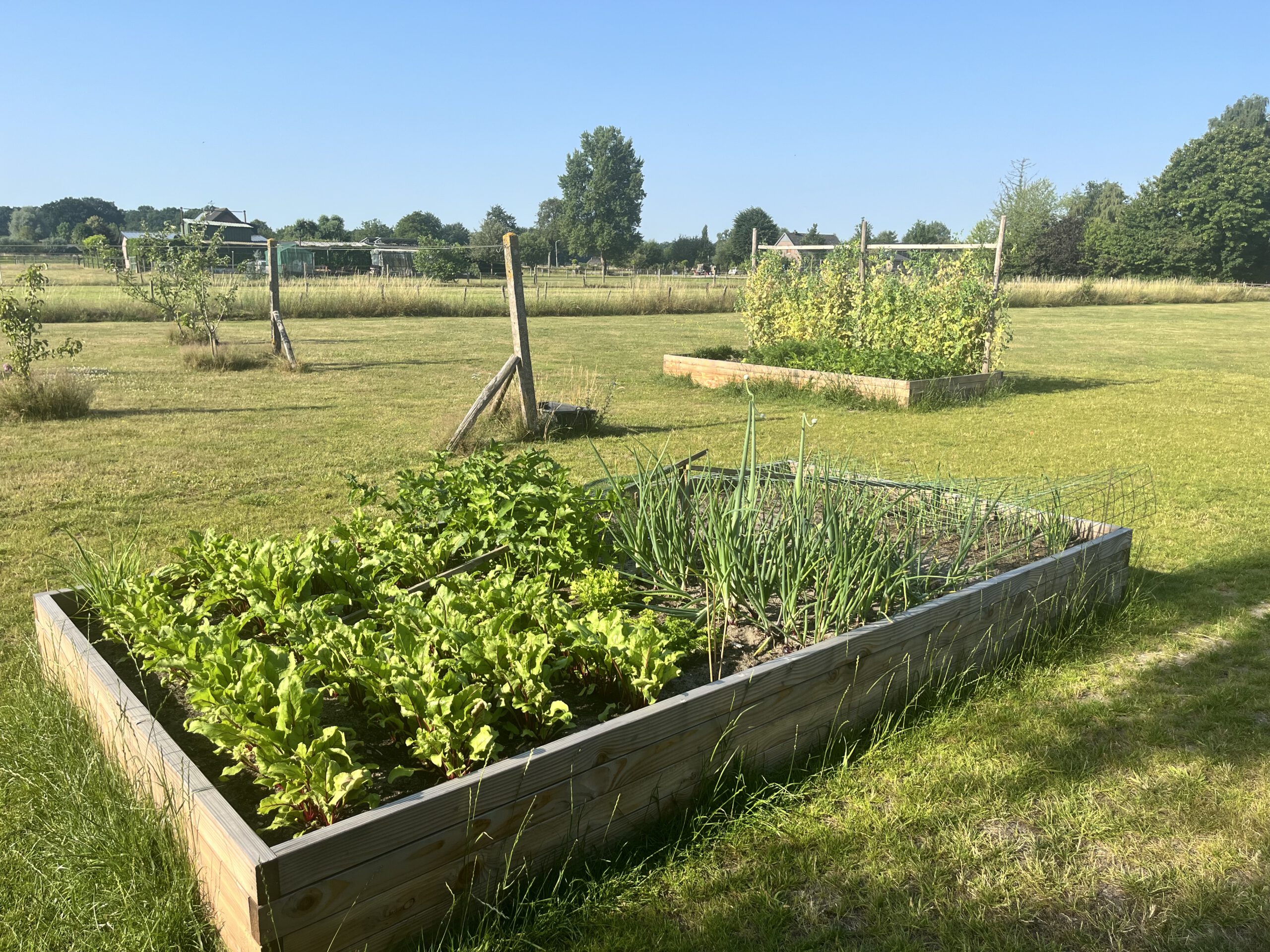 Een jaar later is ook de achtertuin voor een groot deel gerenoveerd. Eerst is veel opruim- en grondwerk uitgevoerd waarbij een hoger gelegen terras is verwijderd om ruimte te maken voor meer groen. Nabij de tuinkas en tuinschuur zijn bestaande verhardingen hergebruikt. Verder is de beekloop gedeeltelijk hersteld en voorzien van een nieuwe brug en vlonderterras van massief Eiken planken van Van Vliet Duurzaamhout. Ook hier wordt aan moestuinieren gedaan, er zijn enkele moestuinbakken gerealiseerd en de bessenkooi is opnieuw gemaakt. Tenslotte zijn de nieuwe borders voorzien van een rijk sortiment van voornamelijk duurzaam gekweekte vaste planten van Lageschaar. Op deze manier is een tuin vol biodiversiteit ontstaan die nu weer goed bij te houden is voor deze enthousiast tuinliefhebbers.